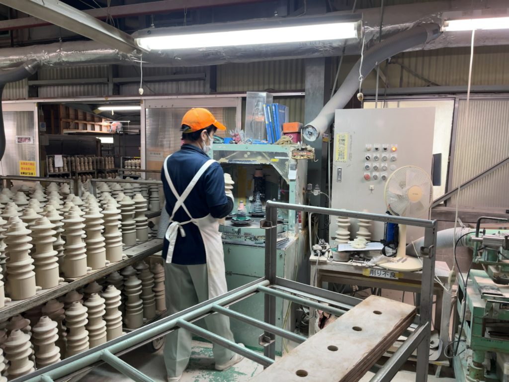 職人さんが流れるようにサクサクと進めていますが、まだ柔らかい碍子。ここで傾きを微妙に調整しているらしいです。