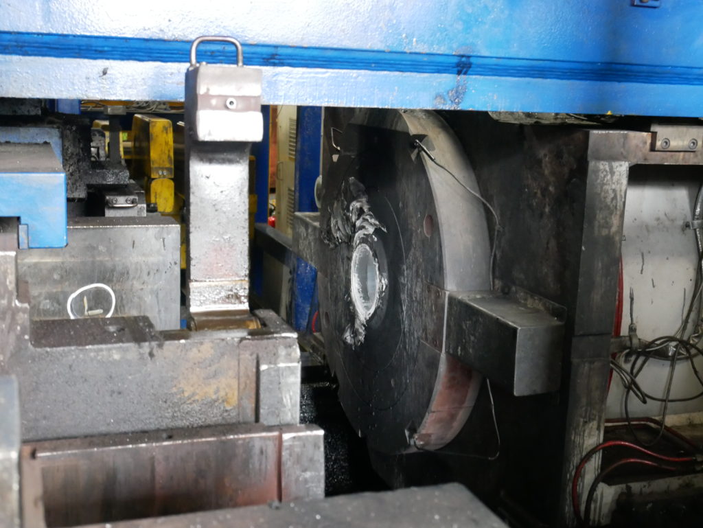 熱したビレットと型をマシンにセットし、2500トンの力で押し出します。