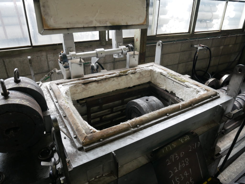 ビレットという円柱の材料(加藤軽金属工業さんではアルミニウム)を仕入れ、ビレットヒーターで460度ぐらいに加熱します。