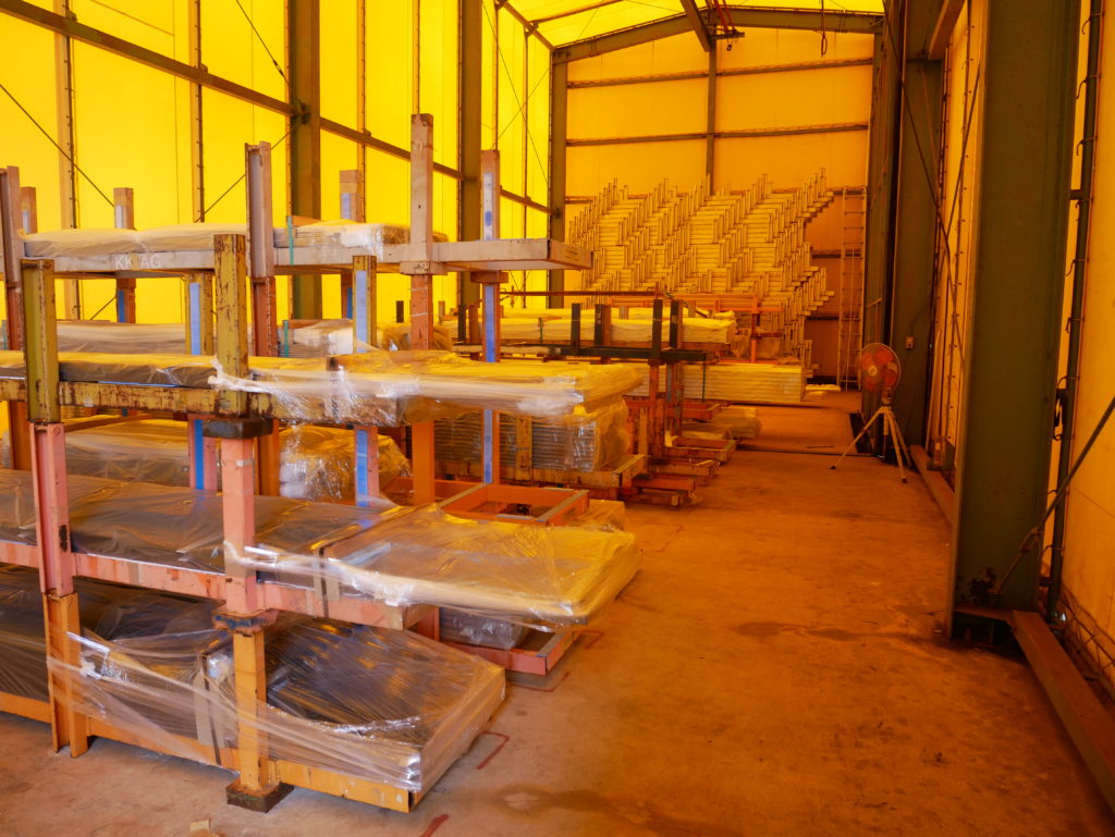 成形されたフレームは長いレーン上に、どんどん製造されていき、この場で自然冷却します。
