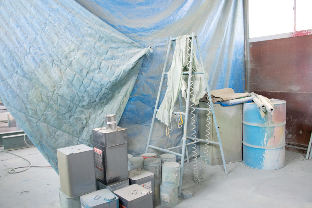 「全然片付いてなくて、汚くてごめん!」と恥ずかしげに紹介してくれた竹内麻莉江さんですが、塗装エリアは前衛アートな雰囲気でワクワクしました!
