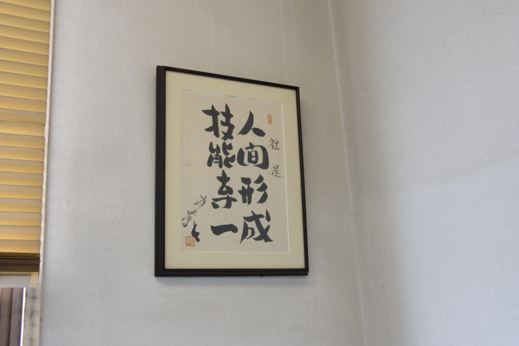 昭和40年に法人として設立し、昭和50年頃に今の場所、緑区鳴海町に引っ越し、今に至ります。竹内長一さんは手先器用なだけでなく、芸術的な一面があったようで、ところどころ書を残しています。
